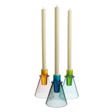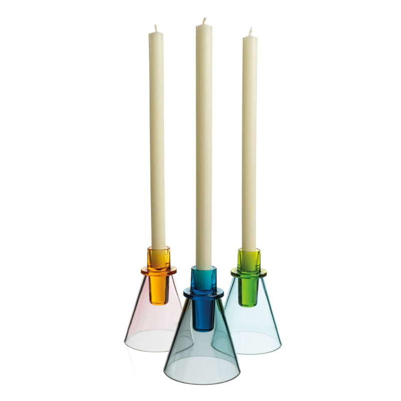 These new candlesticks are part of David Mellor's coloured glass range, designed by Corin Mellor and produced exclusively for David Mellor by the same traditional family company that makes their coloured glass bowls and candleholders.